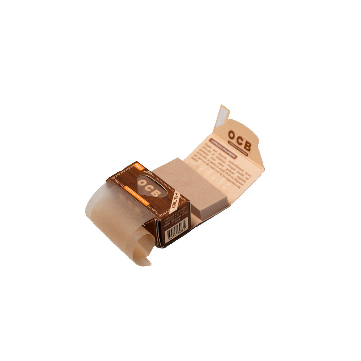 Papel OCB Virgin en formato rollo de 4 metros, con 24 tips también sin blanquear en cada rollo. El papel OCB más natural de la marca, fabricado sin blanqueantes 100% sostenible.