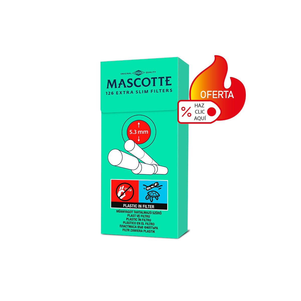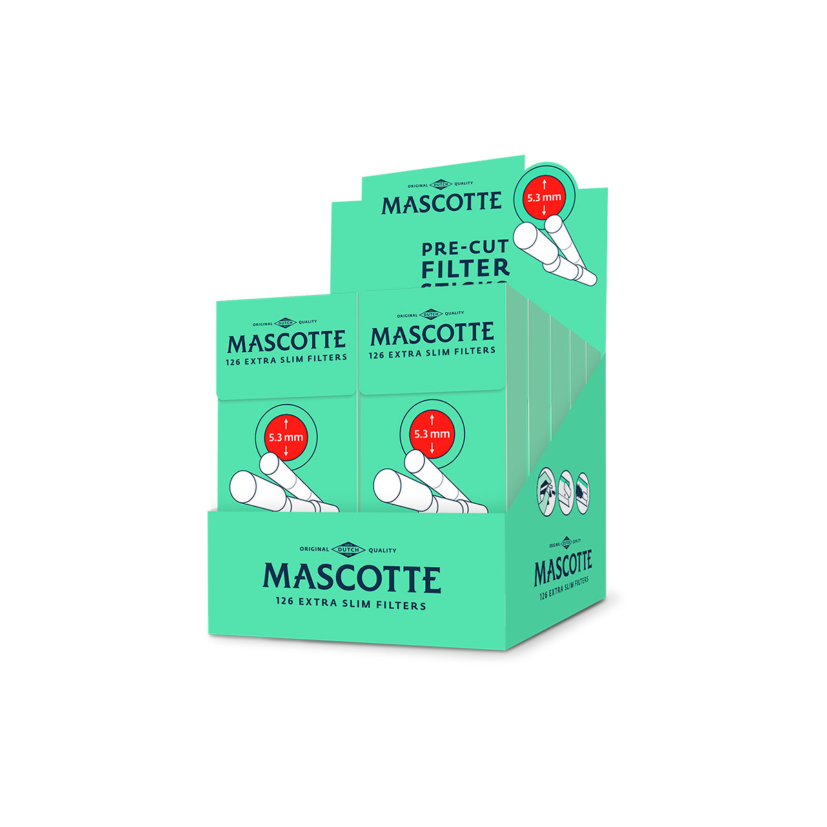 En cada estuche hay 20 boslitas que contienen 150 filtros Mascotte. Estos filtros tienen un diametro extra slim de 5,3 milímetros y una largura de 19mm.